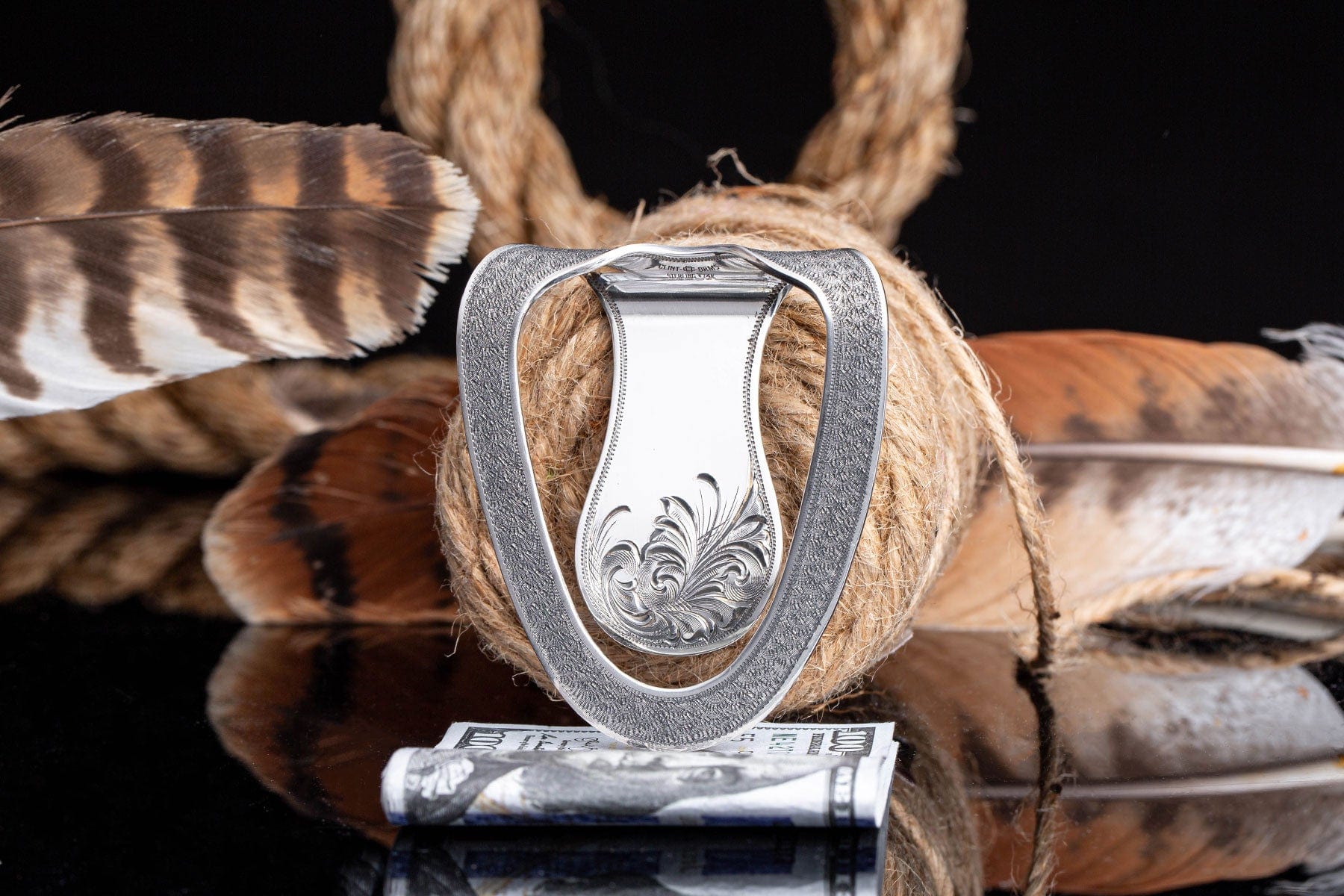The San Jacinto 1601 Dual Gold Quail Money Clip is a bold sterling silver piece featuring two quail in motion—one crafted from 14-karat red gold and the other from 14-karat green gold. The dynamic design is set against Clint Orms’ signature wheatgrass engraving, accented with an elegant matte finish for added depth and contrast. Handmade and engraved in Texas by Clint Orms Engravers & Silversmiths, this money clip reflects exceptional craftsmanship and timeless Western artistry.