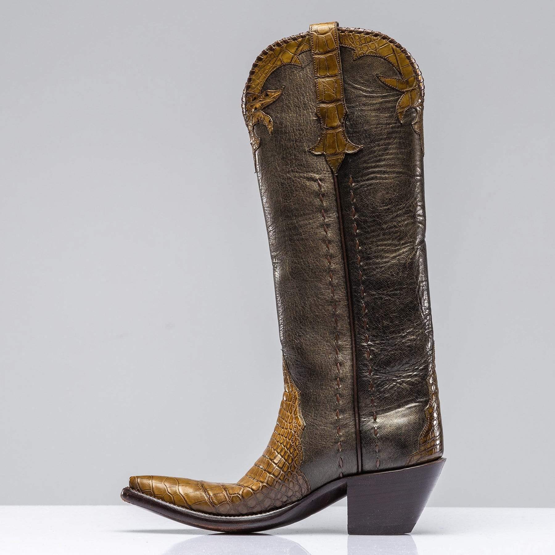 A contemporary, elegantly high, feminine pair of cowboy boots that make your legs look long and slender. Worn with skinny jeans or a party dress depending on the occasion, they're sure to turn heads.,This olive green " Majestic' model is an eye-catcher, 15.5 inches high, composed of the softest goatskin, buck- stitched along the side seams, and with an added layer of scalloped Nile crocodile skin tanned in South Africa on the wingtip, heel counter, and collar.The skin is unusual; a goatskin tanned in the Himalayas in a way where green and bronze are layered upon one another for a subtle “pearlized" appearance.Whether you choose to wear primarily black or brown, this beautiful boot will complete your look. I have found it to be a must in my wardrobe., Downsize half a size unless you have a very high instep or wide foot. As with all our cowboy boots, this pair is handmade by Stallion Boot Company of El Paso, Texas, by artisans with 30 to 50 years' experience. All boots are strictly made of leather components, steel shanks, handmade leather toe boxes, with wooden pegs on the soles, and all detailing is done by hand, allowing for the best comfort, design and long lasting life of the boot. Wear them with pride, and kick up your heels!