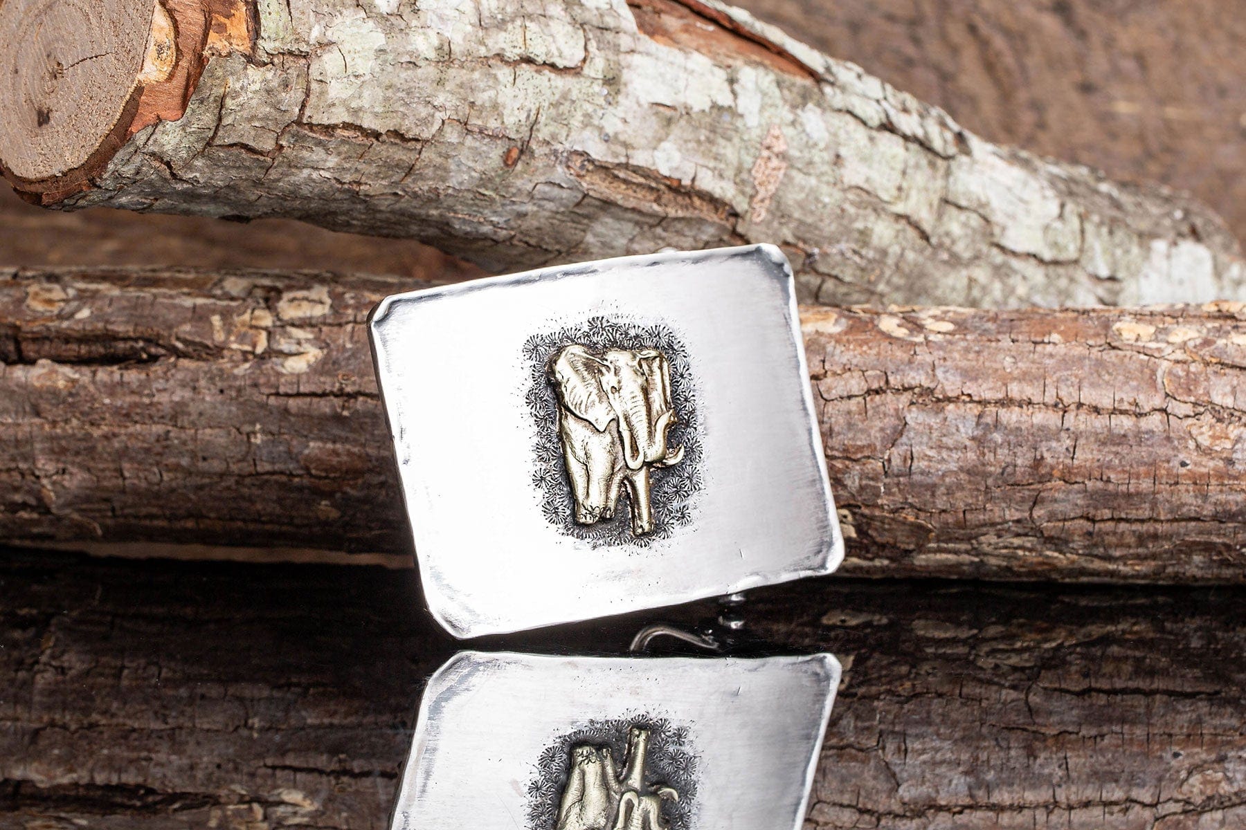 The Clint Orms Starr 1500 Trophy Buckle is a bold and finely crafted piece of Western silversmithing, designed to capture both strength and elegance. Measuring 2.7" x 1.9", this rectangular sterling silver buckle is forged from 12-gauge silver and finished with a brushed surface and hammered edges for a rugged yet refined look. At its center, a large safari elephant in 14k green gold stands in striking relief, surrounded by delicately engraved wheatgrass detailing that enhances its depth and character. The buckle is completed with a 1.5" swinger back, allowing for a secure and versatile fit. Handcrafted in Texas, the Starr 1500 is a distinguished expression of artistry and heritage.