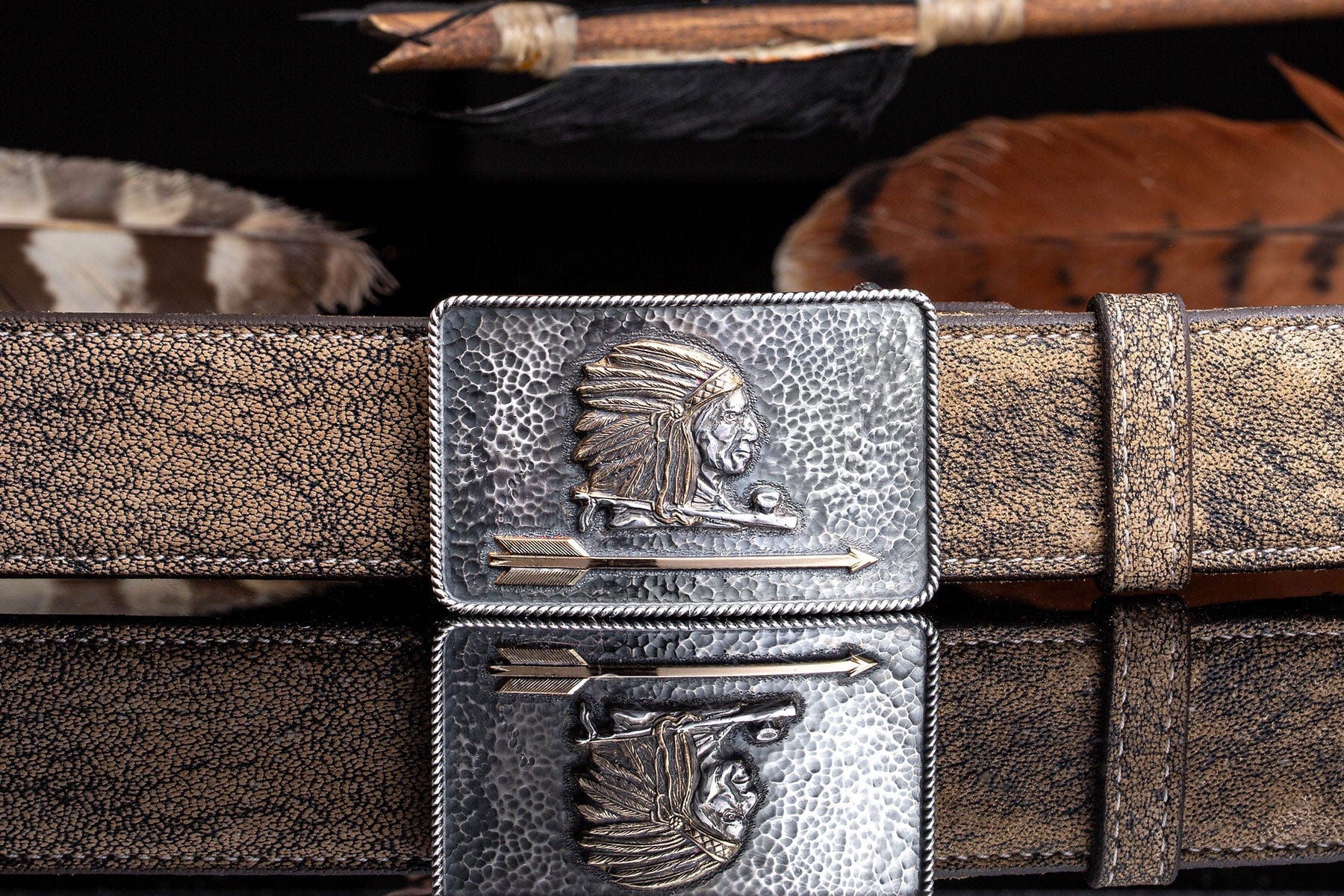 The Clint Orms Zapata 1410 Trophy Buckle is a masterwork of Western silversmithing, entirely handcrafted in Texas. Its hand-hammered sterling silver surface provides a rich, textured backdrop for the centerpiece—a die-struck chief’s profile, detailed with a 14k yellow gold headdress. A sterling pipe and a yellow gold arrow add depth and meaning to the design, while an 18-gauge sterling rope edge frames the piece with refinement. Measuring 2.75" x 1.75", this rectangular buckle fits a standard 1.5" belt strap. With its blend of artistry, heritage, and craftsmanship, the Zapata 1410 reflects the unmistakable signature of Clint Orms, making it a striking addition to any collection.