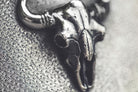 The Clint Orms Reeves 1601 is a striking hand-engraved trophy buckle featuring a bold bison skull set against a detailed wheatgrass background. Signature scrolling adorns each corner, framing the rectangular design with classic Western refinement. Crafted from sterling silver, this buckle measures 3.15" x 2" and is designed to fit 1.5" belts. Handmade and engraved in Texas, it embodies both rugged strength and timeless artistry.