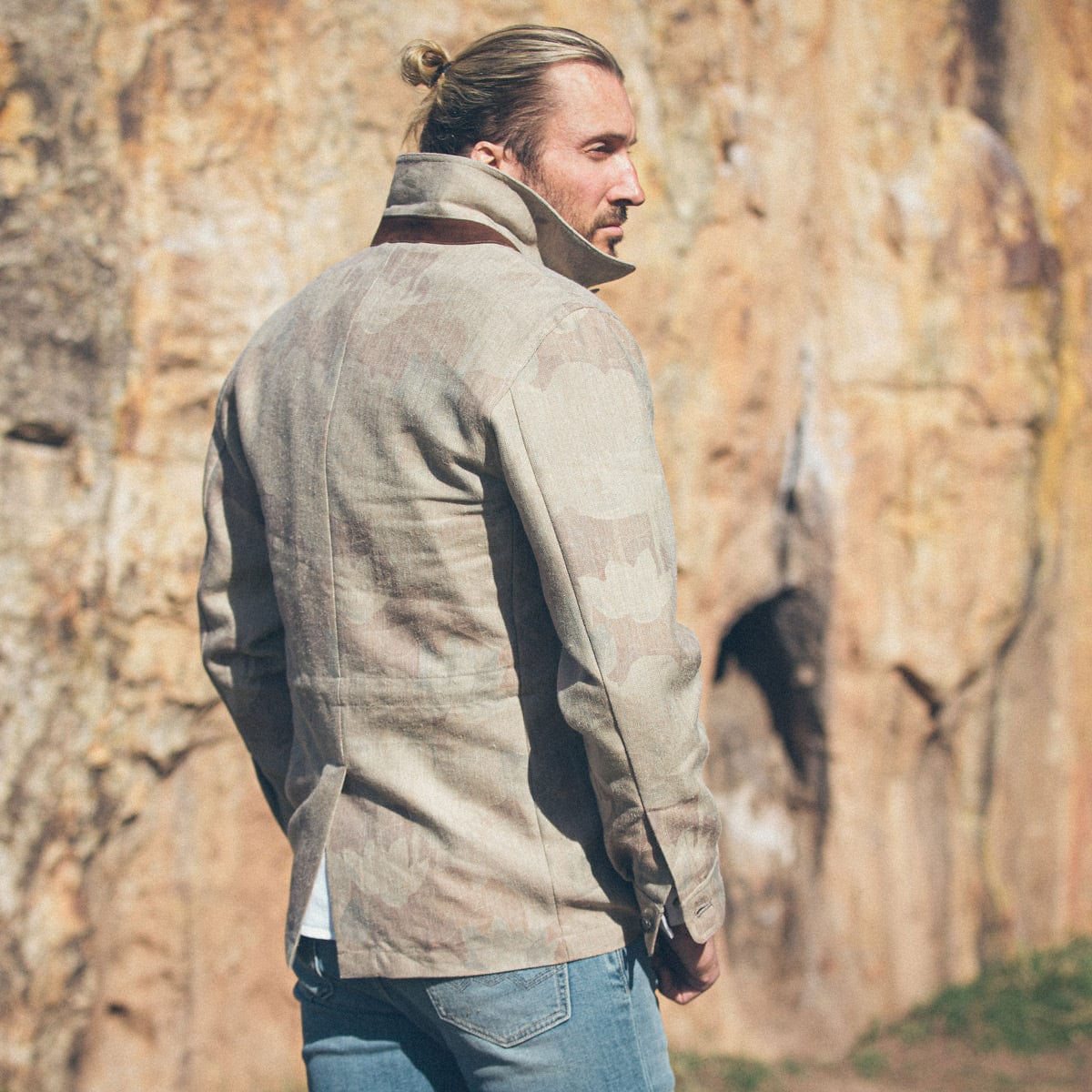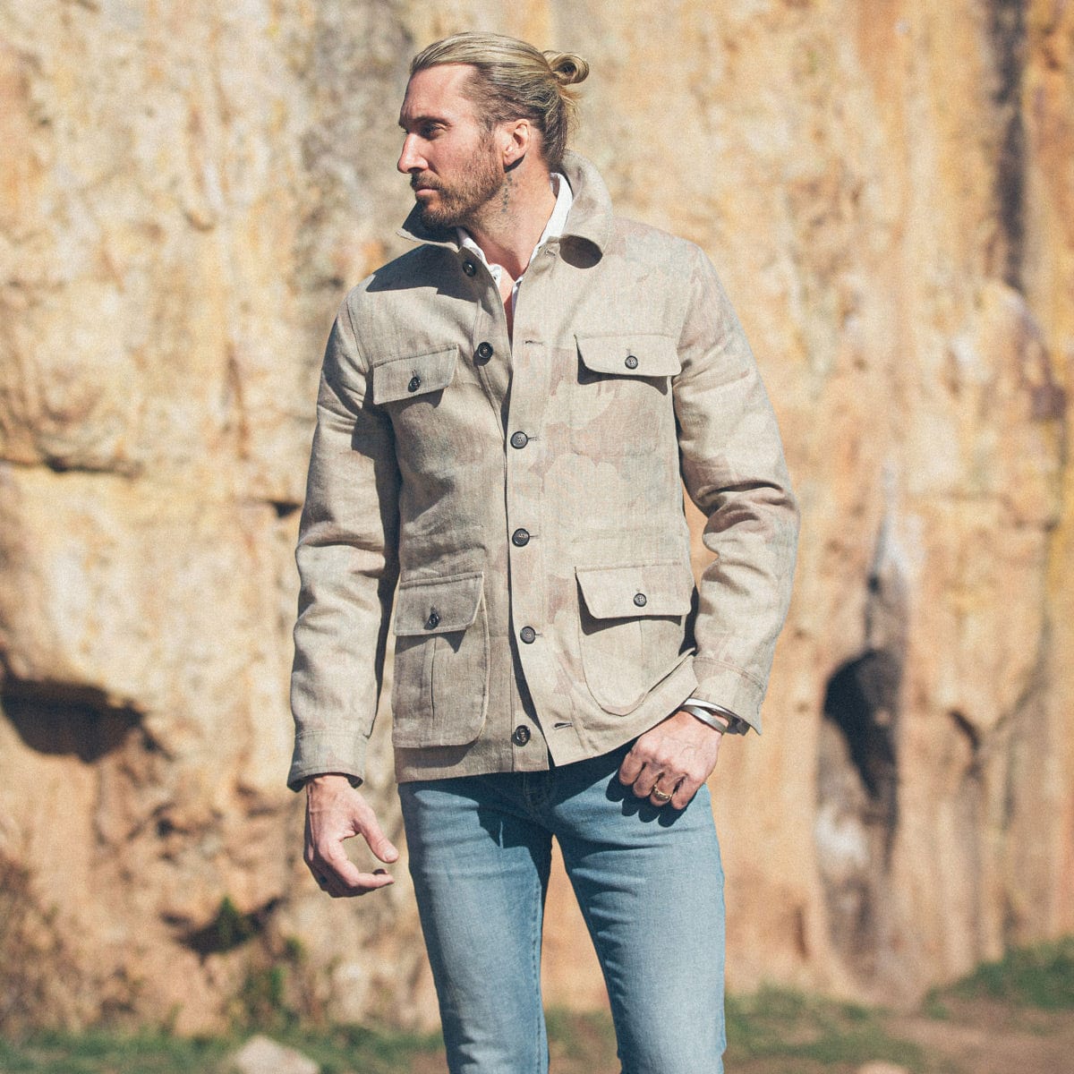 The Cuervo Printed Safari Jacket puts a refined twist on classic fieldwear. Made in Italy from a textured linen blend, the fabric has a soft structure and a sun-faded floral camo print that feels both rugged and elevated. Four utility pockets and a sharp, structured collar add functional charm, while the tailored cut ensures it wears just as well in the city as it does off the grid. Finished with horn buttons and a map-printed interior panel, this jacket balances effortless style with worldly detail.