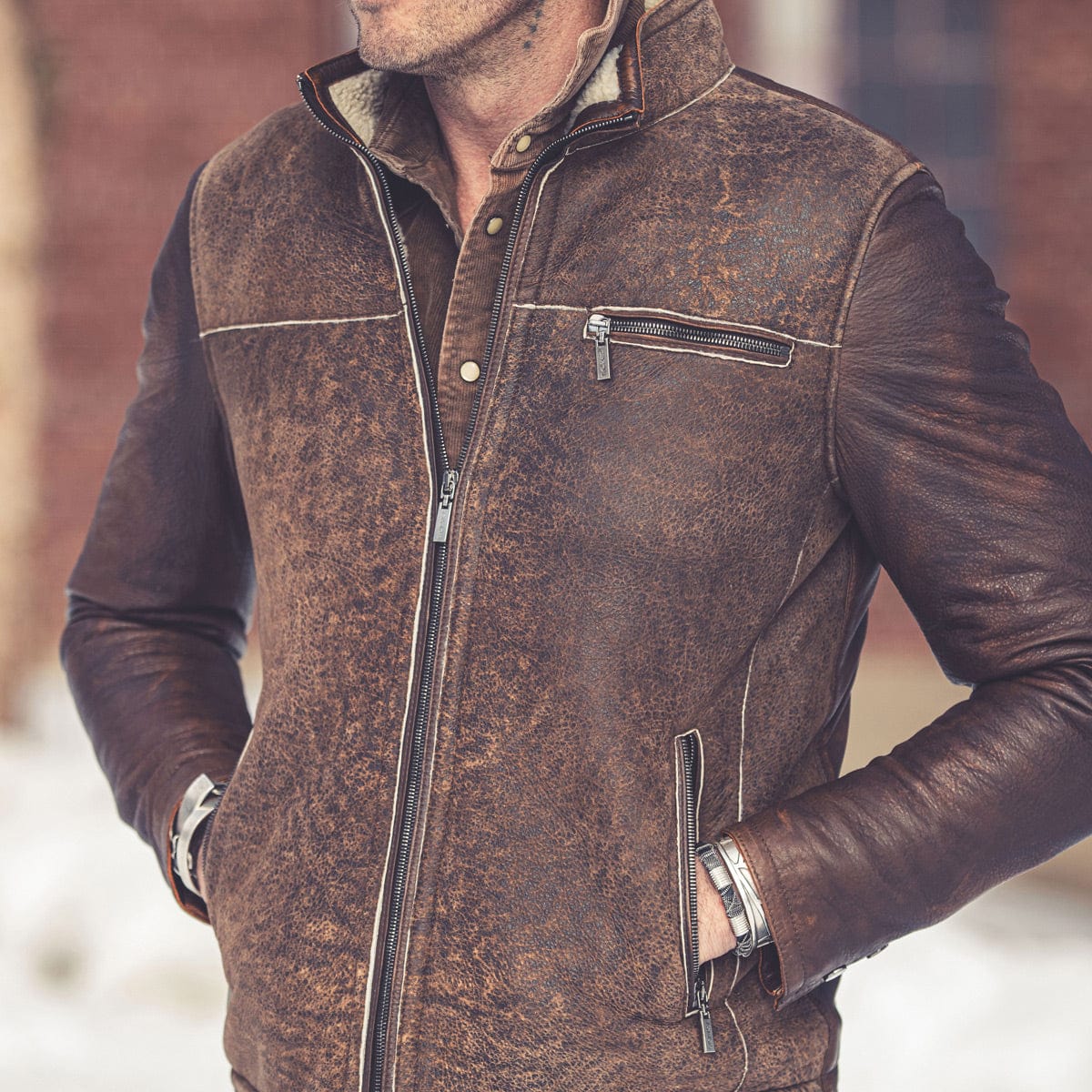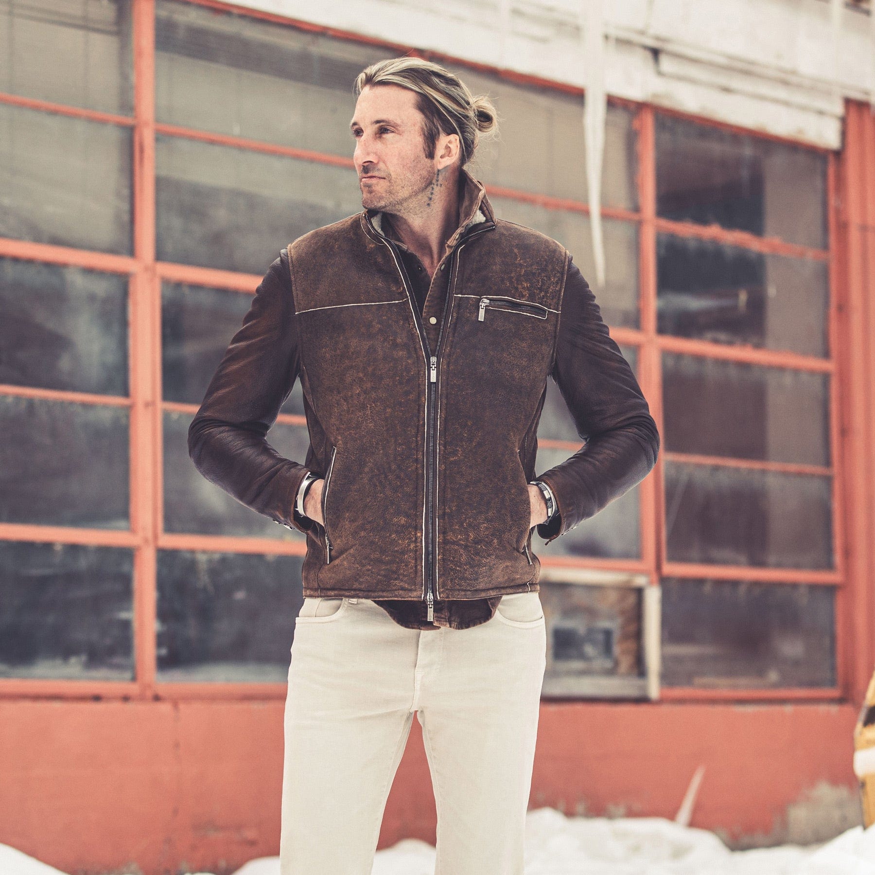 A blend of shearling front panels, with a napa leather back and sleeves, the Landon is a mid-weight shearling that serves as a three-season mountain jacket. A mix of town and country, sport and luxe.