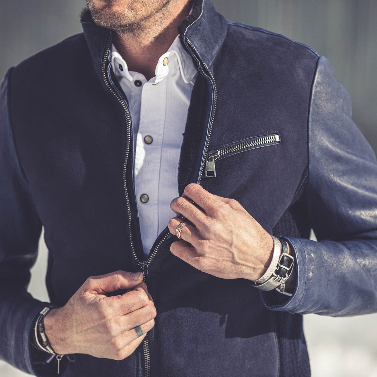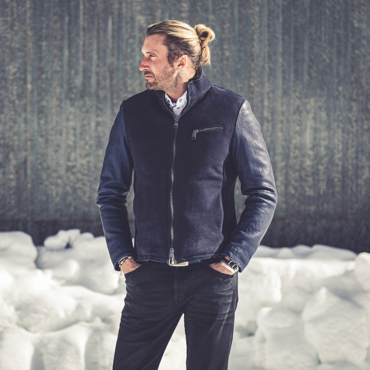 Gimo's Recontato Jacket features genuine shearling, smooth leather, and stretch-knit virgin wool sides. Clean look in front, dash of rugged, nice texture interplay with materials. Warmth and wind protection in shearling front, comfort and breathability from wool-blend sides and lining.