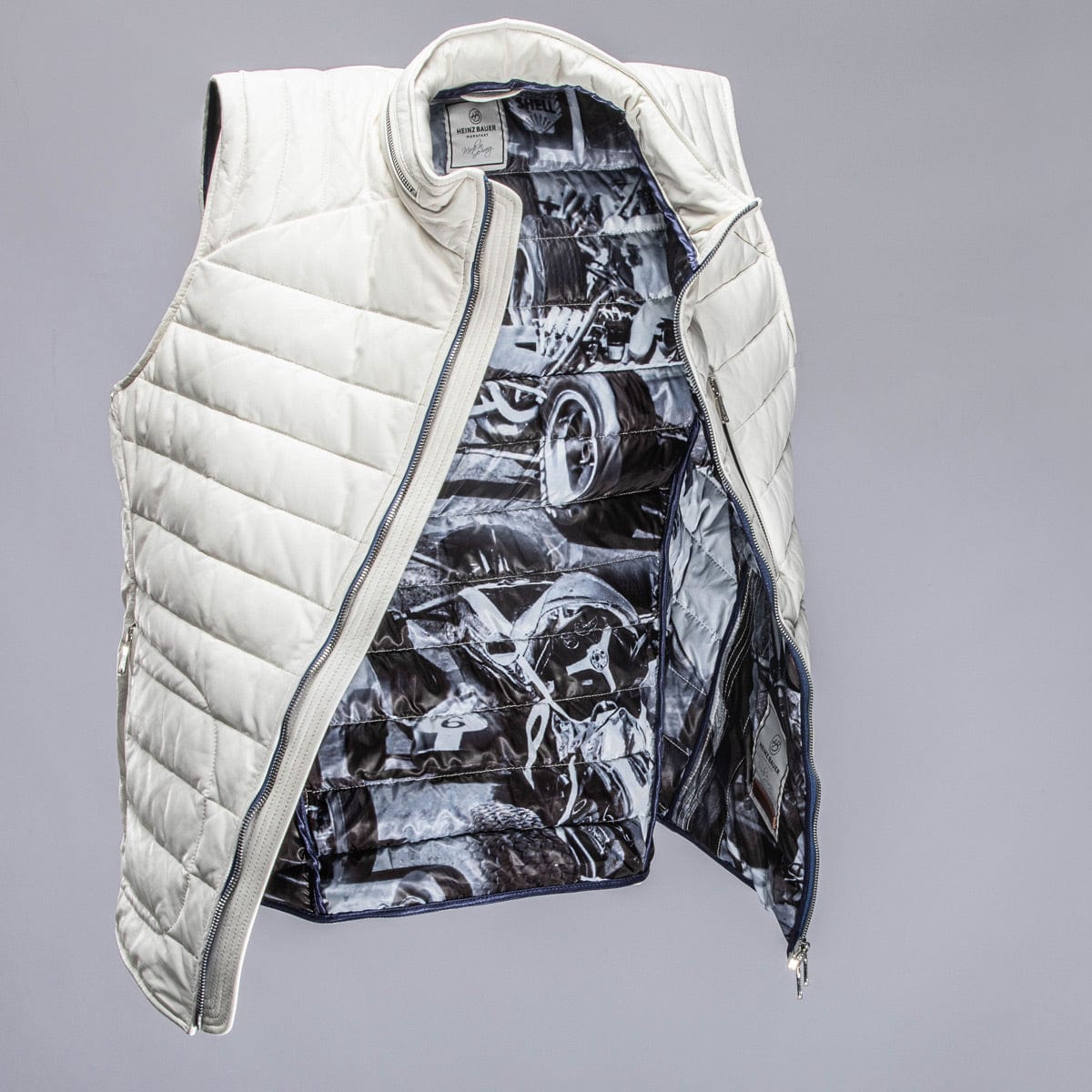 Guaranteed to look sharp in any cockpit, the Saxan, also known as Monoposto, is a sporty, quilted design enhanced by thoughtful technical features. Made of ultra-thin lamb nappa that makes for a wafer-thin, yet quilted insulated duck-down gilet. Formula 1 heritage prints are displayed on the inner lining of the jacket adding just a touch of attitude.