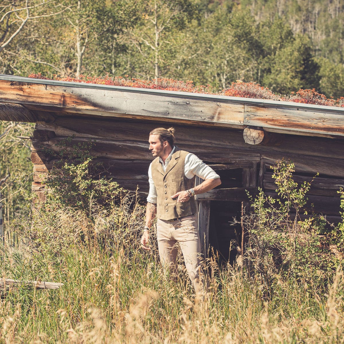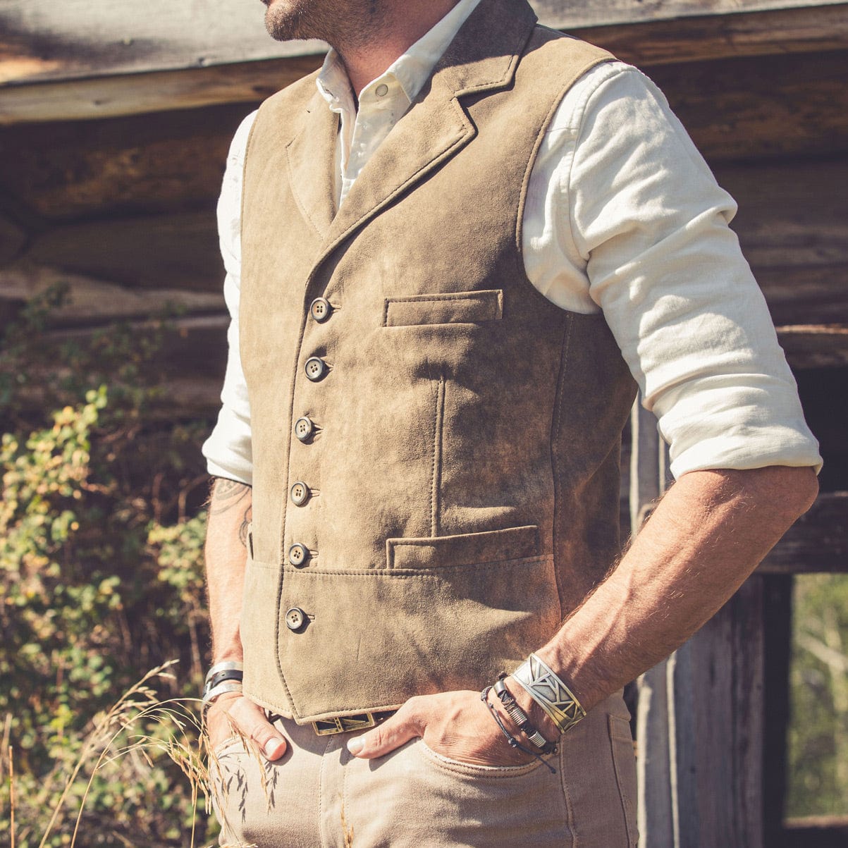 An alpine-inspired waistcoat that blends luxury and classic styling. The Trapp vest made by Meindl, German makers of fine leather goods since 1683, is crafted from a robust red deerskin that has been meticulously tanned using a process dating back thousands of years. The transformation from the rawhide to a finished jacket takes over three months with great care, skill, and experience applied at every stage. The Trapp, done in a vintaged beige with a slightly distressed look, is guaranteed to get even better as the years pass.