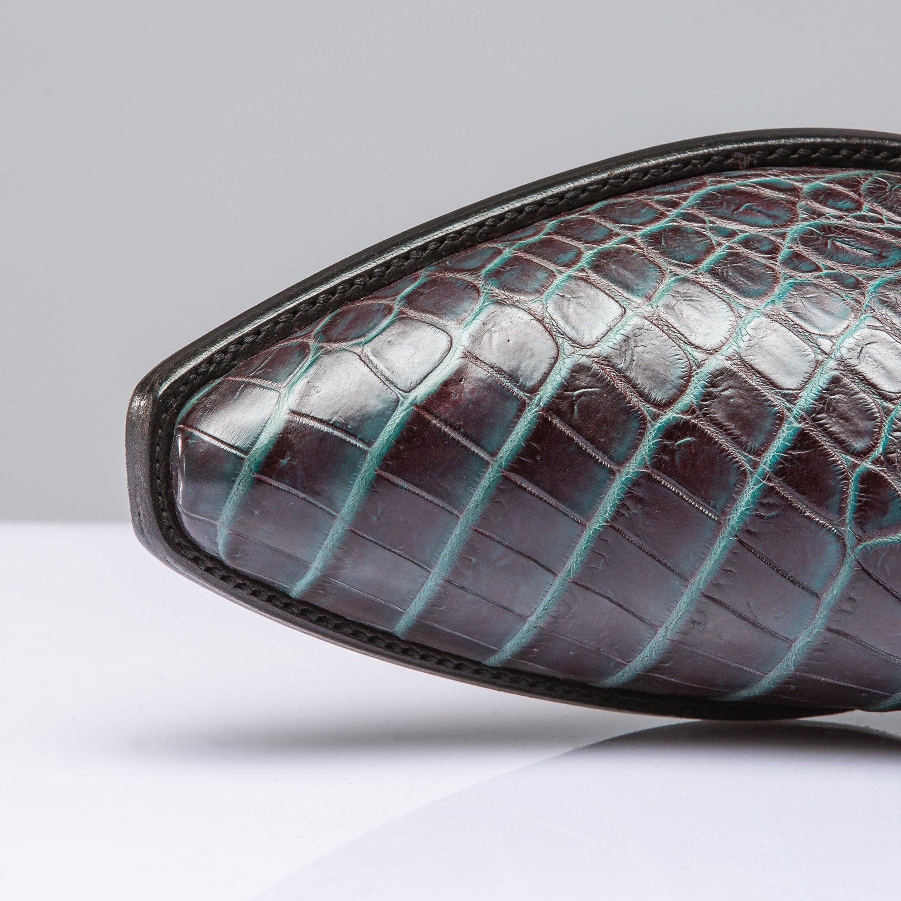 The Gator Zorro Gallegos in Chocolate Brown & Turquoise is bold, refined, and unmistakably distinctive. Crafted from rich American alligator leather, the deep chocolate base is accented with hand-applied turquoise burnishing that settles into the scales, enhancing the natural depth and character of the hide. Finished entirely by hand, each pair carries its own unique variations—no two are exactly alike. The sleek Zorro silhouette keeps the profile clean and modern, while a discreet interior zipper allows for easy on-and-off wear without disrupting the boot’s lines. A confident statement rooted in true Western craftsmanship, the Gallegos Zorro is designed for those who appreciate rare materials, subtle contrast, and timeless design.