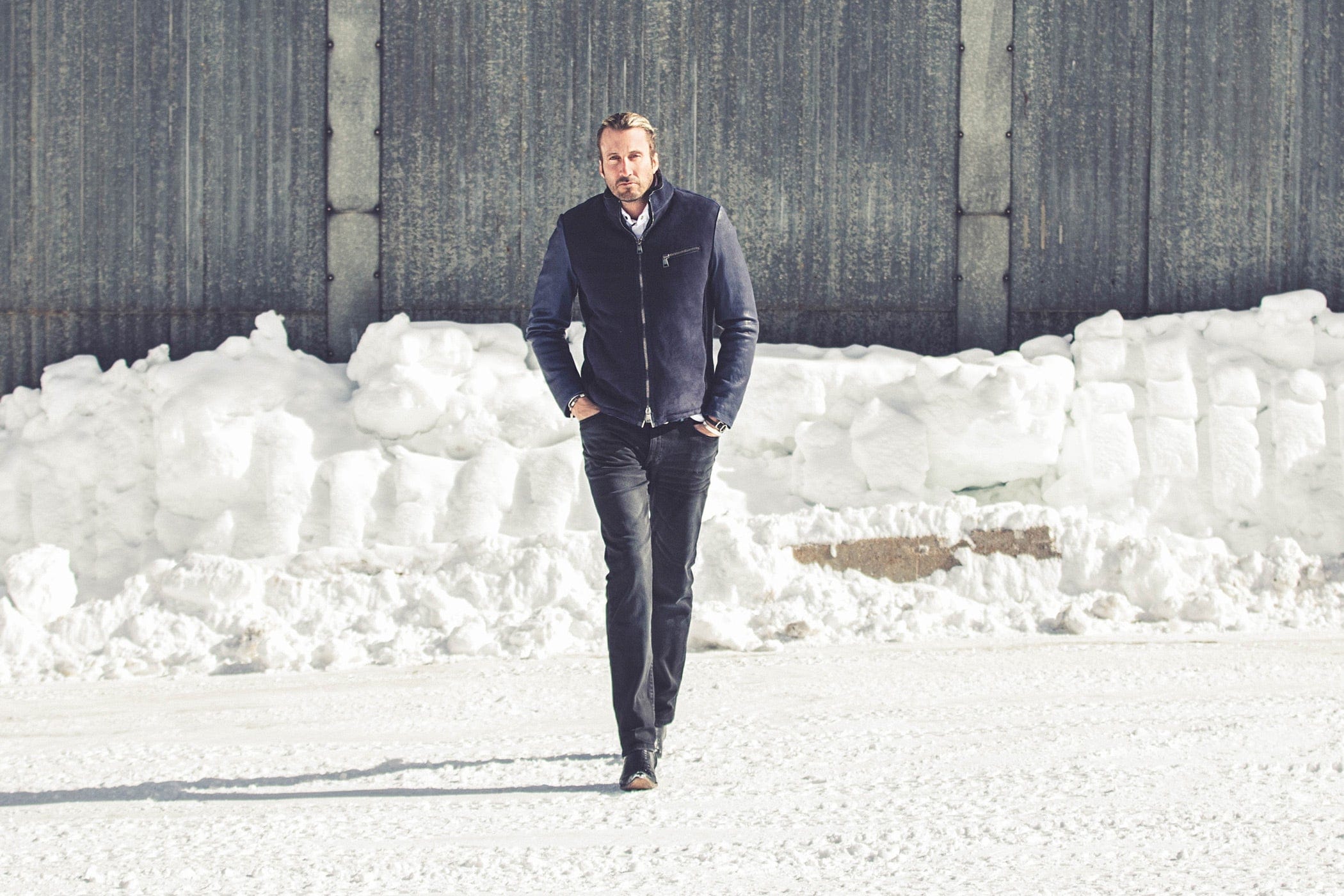Gimo's Recontato Jacket features genuine shearling, smooth leather, and stretch-knit virgin wool sides. Clean look in front, dash of rugged, nice texture interplay with materials. Warmth and wind protection in shearling front, comfort and breathability from wool-blend sides and lining.